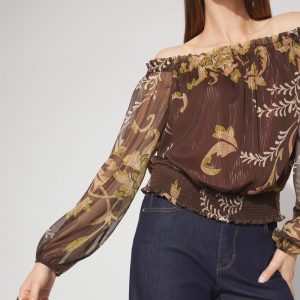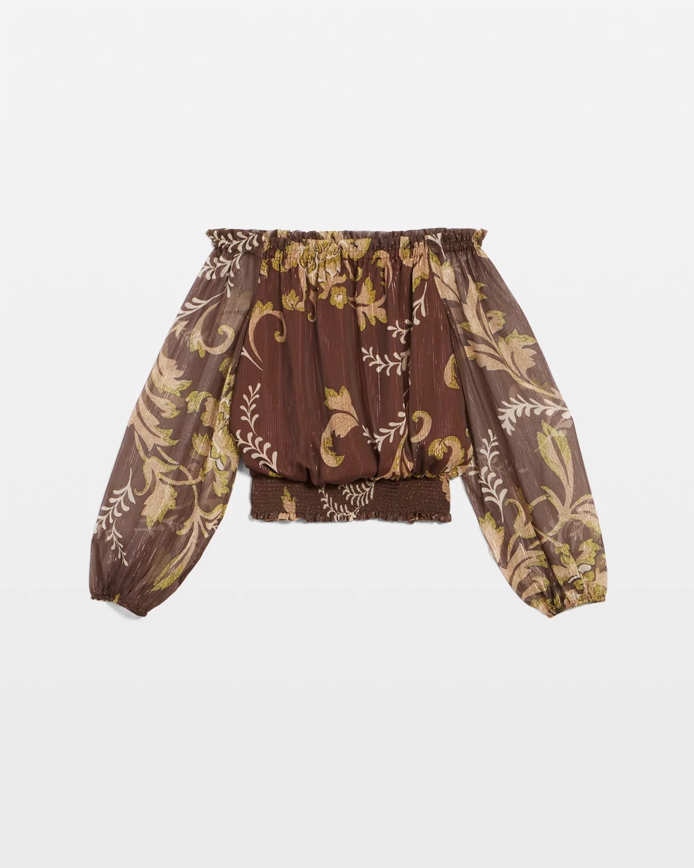 This blouse is why the fashion term “boho chic” was created. A seriously feminine blouse with blouson sleeves, a smocked hem for the perfect + comfortable fit and a fetching floral print with gold lurex throughout for subtle sheen. Wear it with jeans, pants, shorts or a flowy skirt.