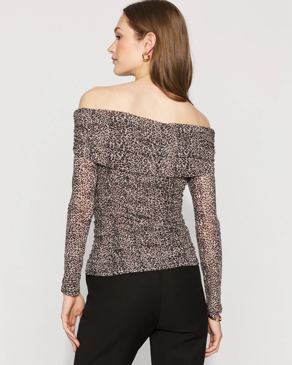 Soft shirring at the princess seams and an off-the-shoulder design combine to create a feminine take on the going-out top. With a slightly sheer mesh fabric, the print is a stand-out for pairing with black pants or jeans.