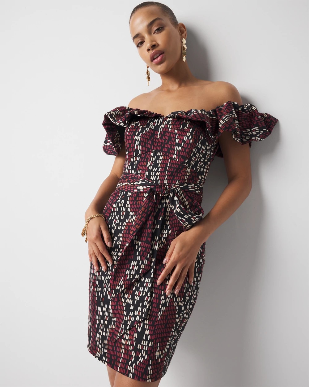 This off-the-shoulder dress is made from a cotton and lyocell blend. The bodice is designed with boning in front and back seams with an invisible center back zipper. Style with sleeves off or on the shoulder.