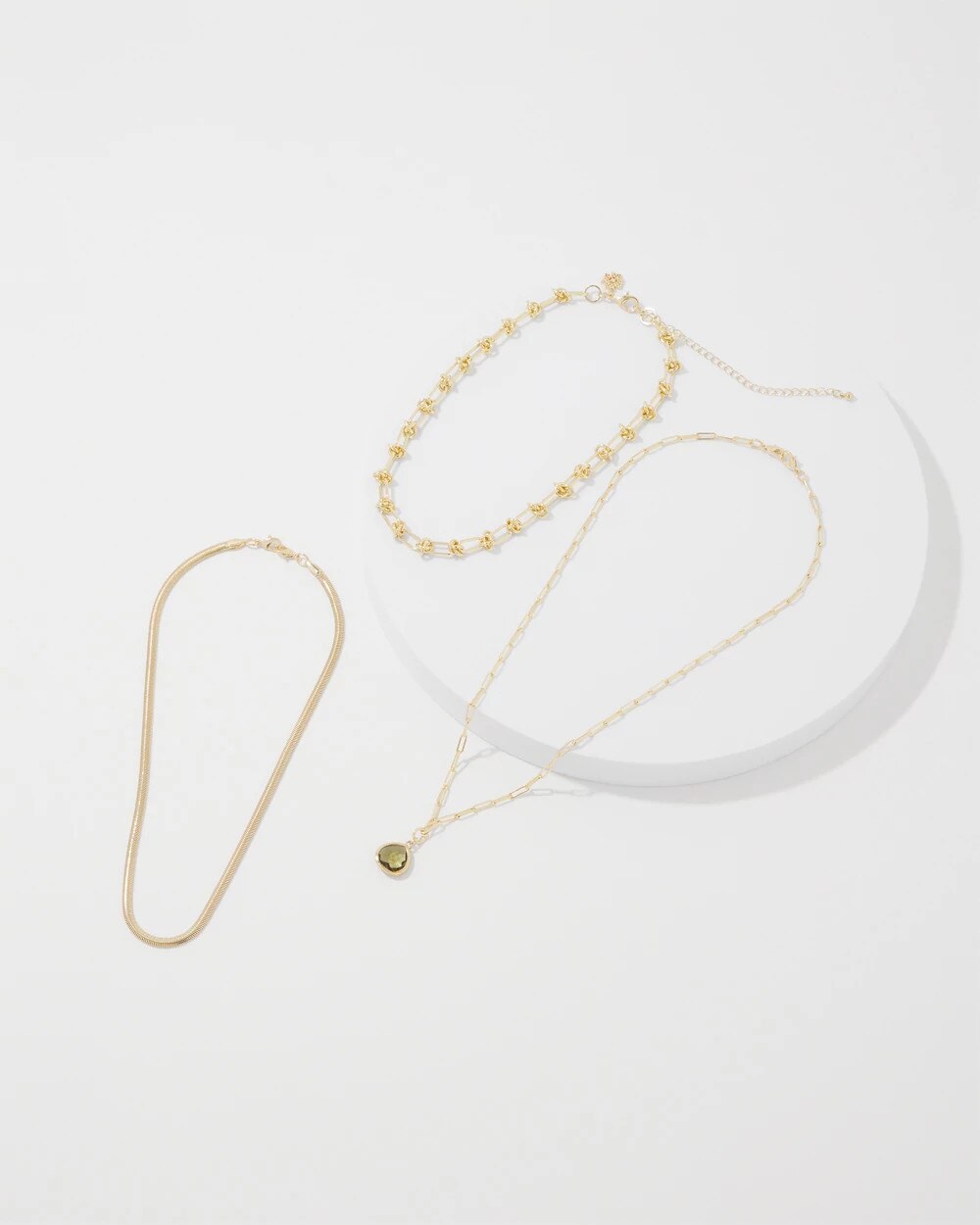 Designed with a single olive hued glass stone on the longest chain, this convertible necklace converts to 3-single strands. Pair with other pieces from the Olive Group Collection.