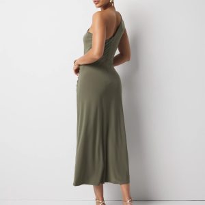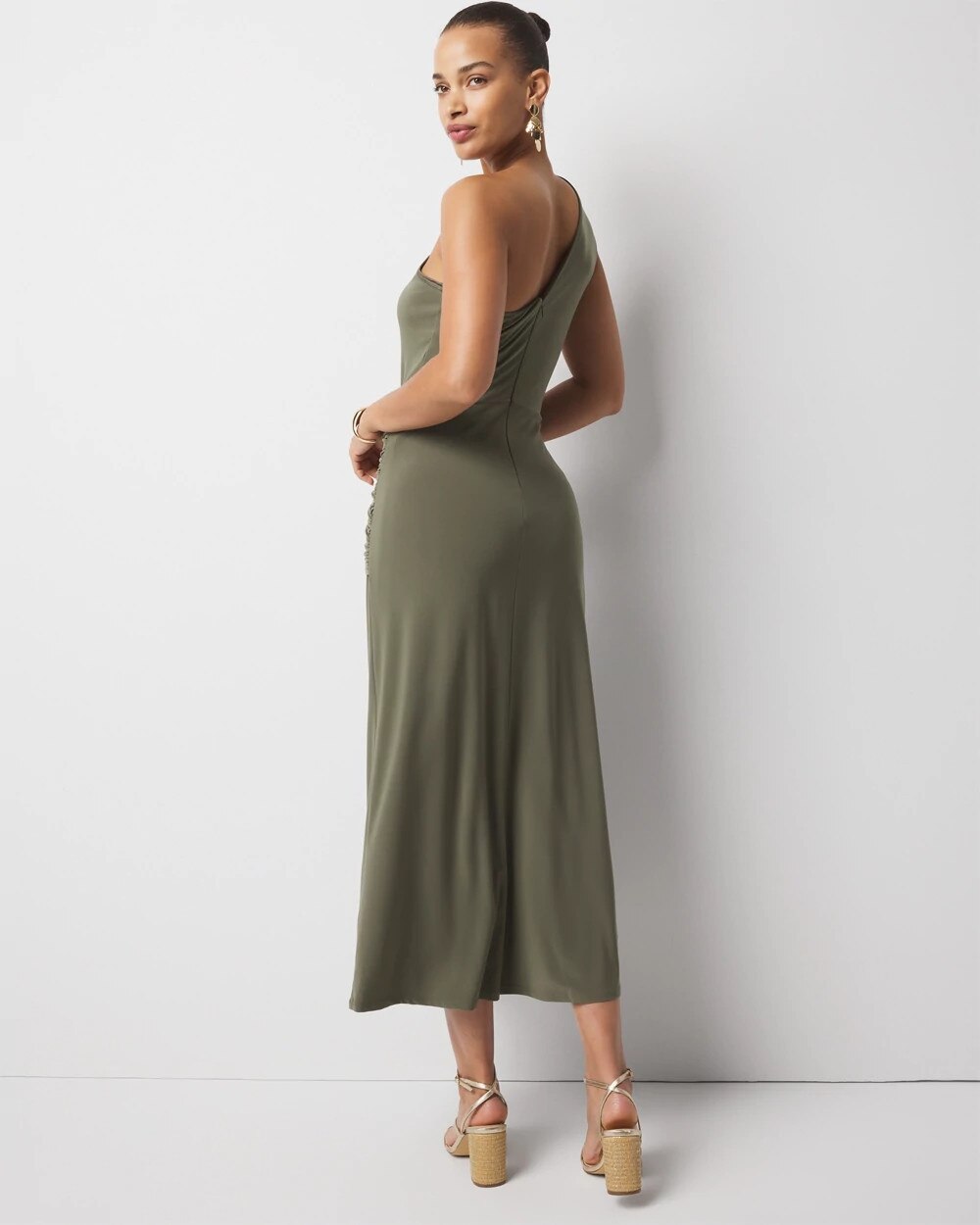 Made from soft matte jersey which has a flattering drape quality, this one-shoulder dress has an attached tie at the waist with a sculptural buckle that you can adjust. A simple, clean look for parties and events.