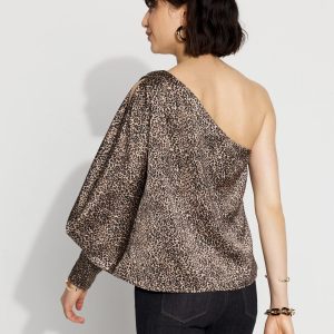 Instantly add drama to black pants or denim with this one-shoulder satin blouse. An asymmetric neckline bares one shoulder, while the draped sleeve has a cutout to allow some skin to peek through.