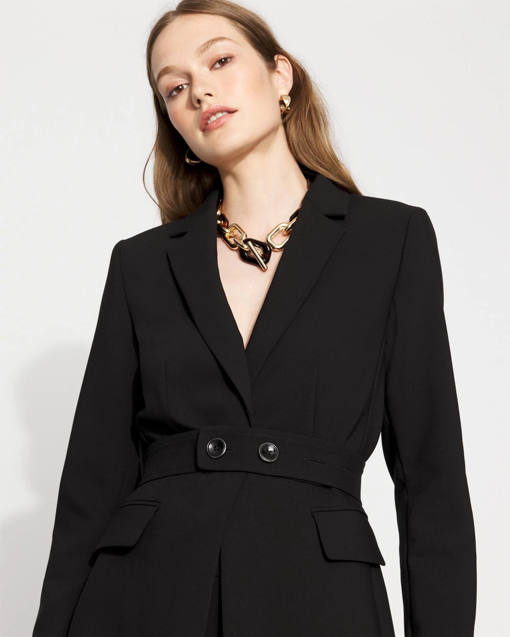 We added a belt with two faux tortoise buttons rimmed in gold to our bestselling one-button blazer, giving you a feminine silhouette. The belt is removable, but we think you’ll want to keep this one in place. Crafted from our popular luxe double weave, you can pair this jacket back to any of our pants in the same fabric.