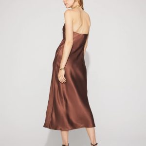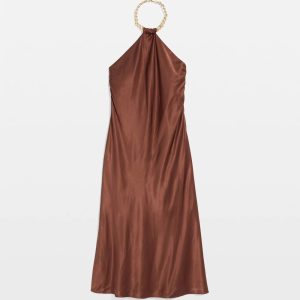 A chunky chain with toggle closure creates the neckline on this satin slip halter dress, instantly elevating the look. An easy go-to dress for parties, just add heels.