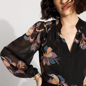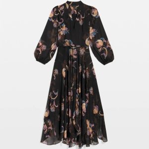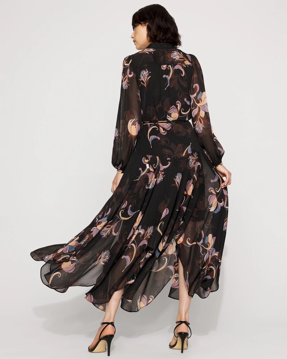 This chiffon maxi dress has a metallic variegated stripe for subtle shine and a handkerchief hem for a romantic, flowy look. We also designed it with a band collar, and a self-belt with a metal O-ring that is removable. Pair with strappy sandals or heels.