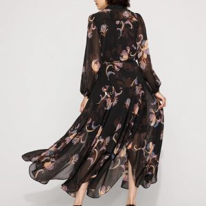 This chiffon maxi dress has a metallic variegated stripe for subtle shine and a handkerchief hem for a romantic, flowy look. We also designed it with a band collar, and a self-belt with a metal O-ring that is removable. Pair with strappy sandals or heels.
