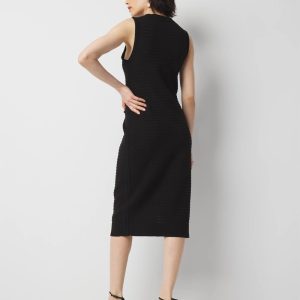 This lightweight knit dress is an easy pull-on style with contrasting braid trim, ruching on wearer’s left and a side slit on the right. A fitted, sexy style that will work with strappy heels or take it down a notch with flat sandals or sneakers.