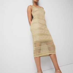 The open stitchwork on this tank dress adds a flirty + feminine vibe. Designed with an illusion lining to reveal bare skin below the knee and a scoop neckline. Metallic lurex throughout the yarn gives this sleeveless midi dress the perfect summer glow.
