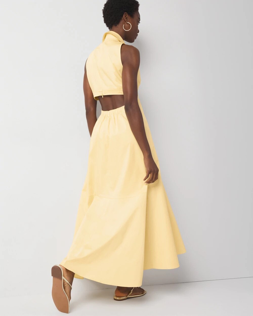 This easy on the eyes summer dress has a shirt collar and knot at the bust for a halter top look. The cut-out at the waist exposed a sliver of your back. A great look for summer parties.