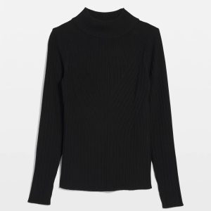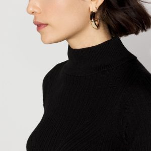 Everyone needs at least one fitted mock neck sweater; it’s a wardrobe essential. Easy to layer under jackets and blazers, it’s also a sleek look with jeans, pants and leggings or skirts. This one is ribbed for ease.