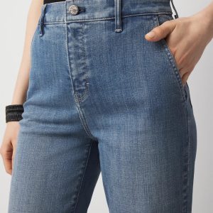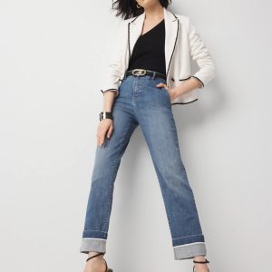 Form fitting at your waist and hips to show off your curves, this jean then has a relaxed straight fit from thigh to ankle. We’ve added fashion details including square back pockets, front slash pockets and high cuffs with white piping, giving these jeans an on-trend carpenter vibe.