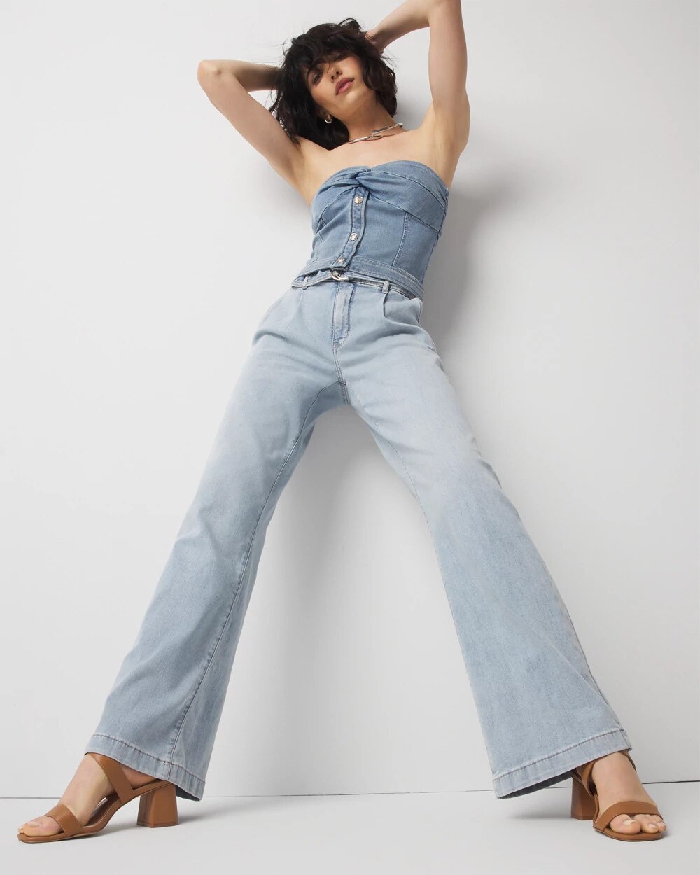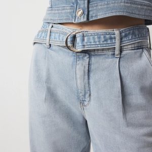 We designed this jean with classic trouser elements including front pleats, welt pockets and a relaxed wide-leg silhouette. We added a self-belt with gold D-ring and contrast stitching. A polished look cut from lightweight denim that is ideal for summer.