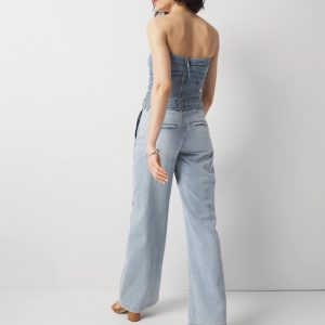 We designed this jean with classic trouser elements including front pleats, welt pockets and a relaxed wide-leg silhouette. We added a self-belt with gold D-ring and contrast stitching. A polished look cut from lightweight denim that is ideal for summer.