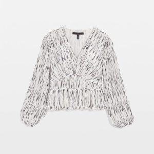 Allover pleats, peplum hem and seam details to define the waist will flatter and add a touch of romance to your outfit. The ikat print is timeless and adds a striking look to this boho-chic blouse. Elastic at the cuffs allow for a blouson effect.