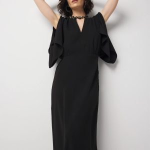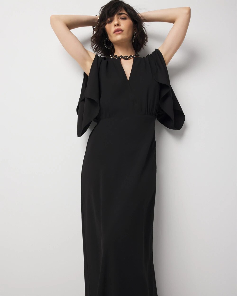 Cue the red carpet, this stunning gown gives us Old Hollywood vibes. Designed with kimono sleeves with a plunging V-neck, this maxi dress has lots of flowy movement thanks to the drapey crepe fabric. The perfect look for any formal or dressy occasion.