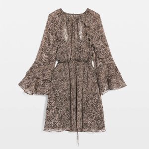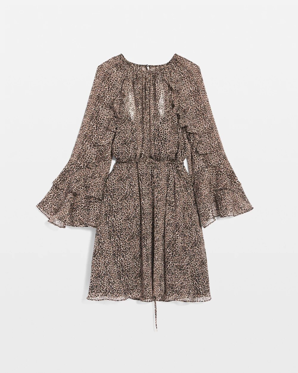 Romance + fashion meet in this short dress that can take you from desk to dinner in style. A neutral, yet chic leopard print is just one detail to love. There’s also cascading ruffles and tiered raglan sleeves, and a removable self-tie belt with a metal O-ring. Wear it with heels or for fall, add tights and tall boots.
