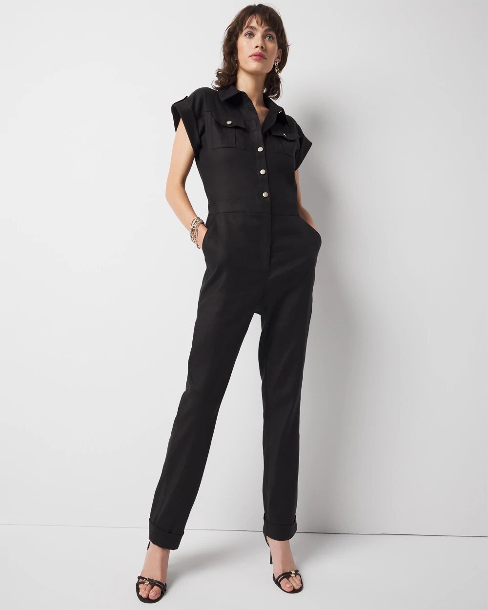 We’ve designed this jumpsuit with a tailored bottom and utility details on top making it a chic choice for the office. Made with front button and zip fly closure as well as shoulder tabs and chest pockets. There is smocking in the back waist for ease.