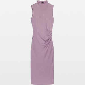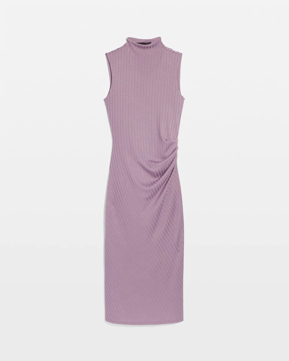 Crafted from a variegated ribbed knit fabric, this bodycon sweater dress has flattering ruching on one side as well as a side slit for ease.