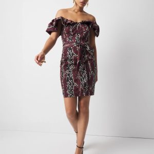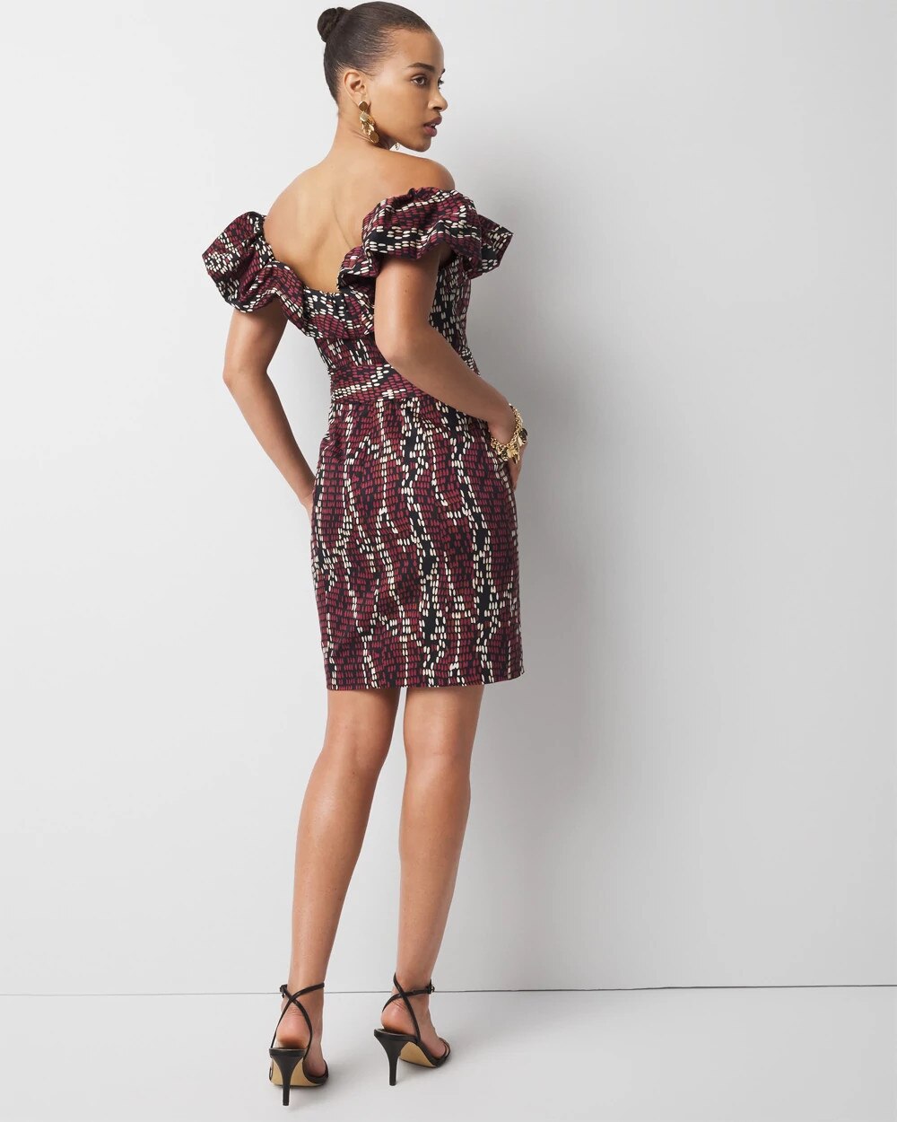 This off-the-shoulder dress is made from a cotton and lyocell blend. The bodice is designed with boning in front and back seams with an invisible center back zipper. Style with sleeves off or on the shoulder.