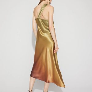 The single shoulder strap on this slip dress is adorned with gold hardware. The sleek satin fabric is dyed with an ombre effect that flows into an asymmetric hem. A social dress that can be worn with strappy heels or sandals.