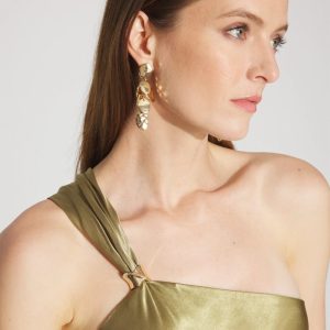The single shoulder strap on this slip dress is adorned with gold hardware. The sleek satin fabric is dyed with an ombre effect that flows into an asymmetric hem. A social dress that can be worn with strappy heels or sandals.
