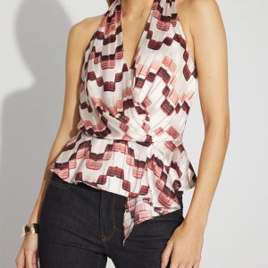 Instantly elevate your denim or shorts with this satin halter top. A surplice neckline is secured with a hook in front, and the fabric extends into an asymmetric peplum hem. Gripper tape ensures a secure fit.