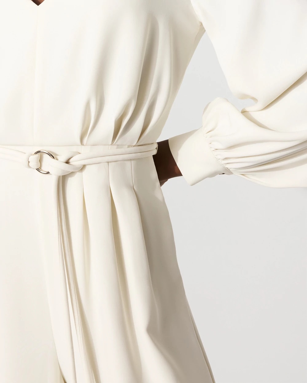 With sheer sleeves, a deep V-neckline and flowing wide legs, this jumpsuit blends tailoring and ease. A removable belt defines the waist. Perfect for dressed-up dinners or drinks.