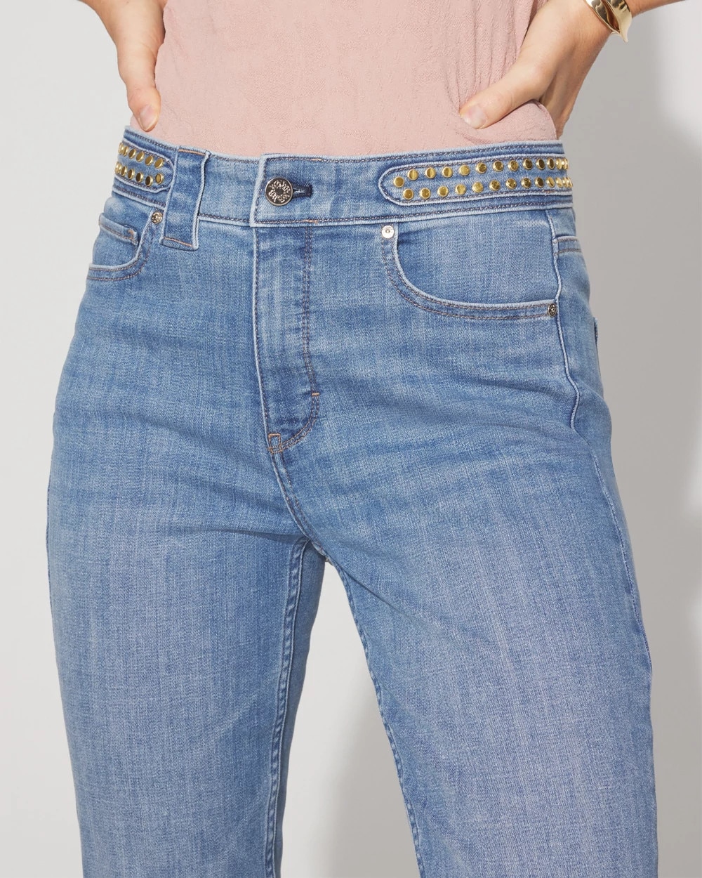 Waist tabs embellished with studs give these cropped high-rise slim jeans a faux belt look that’s perfect for summer adventure.
