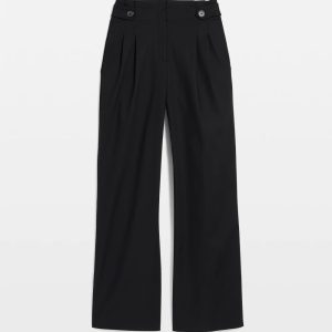 A wide-leg silhouette with a modest paper-bag waist and button tabs defines your figure. Cut from a cotton fabric that holds its shape, these pants have front pleats, pockets and a slightly shorter inseam which makes them easy to pair with a variety of footwear.