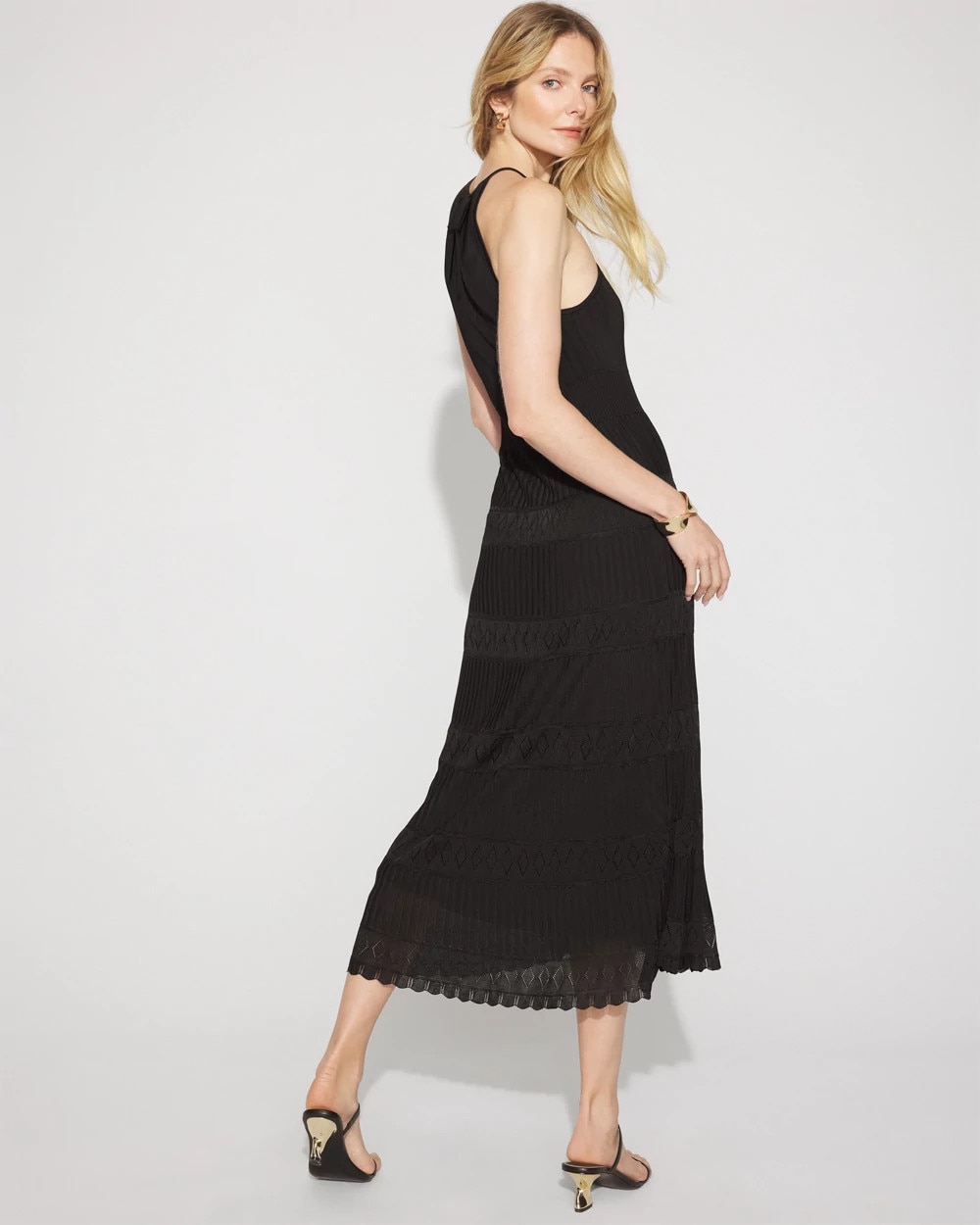 A mixed stitch pattern adds flair to this classic knit halter dress with a tie closure at the back of the neck. A great look for summer date nights or pair with flat sandals for a chic day look.