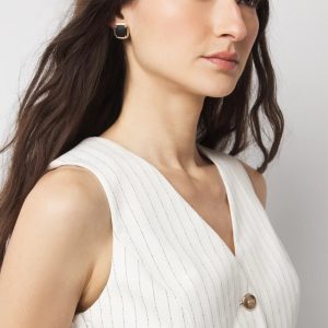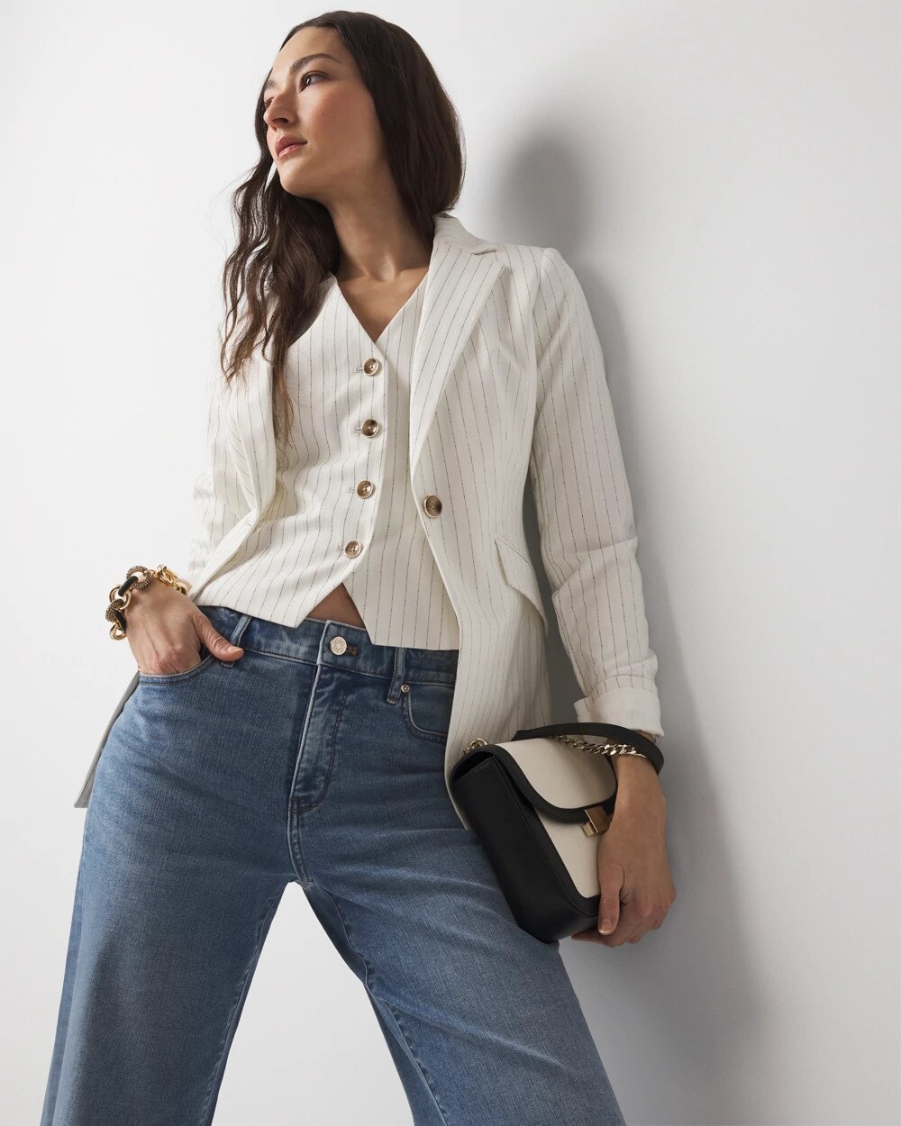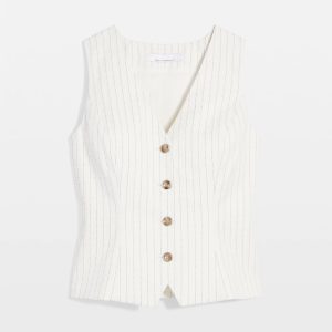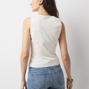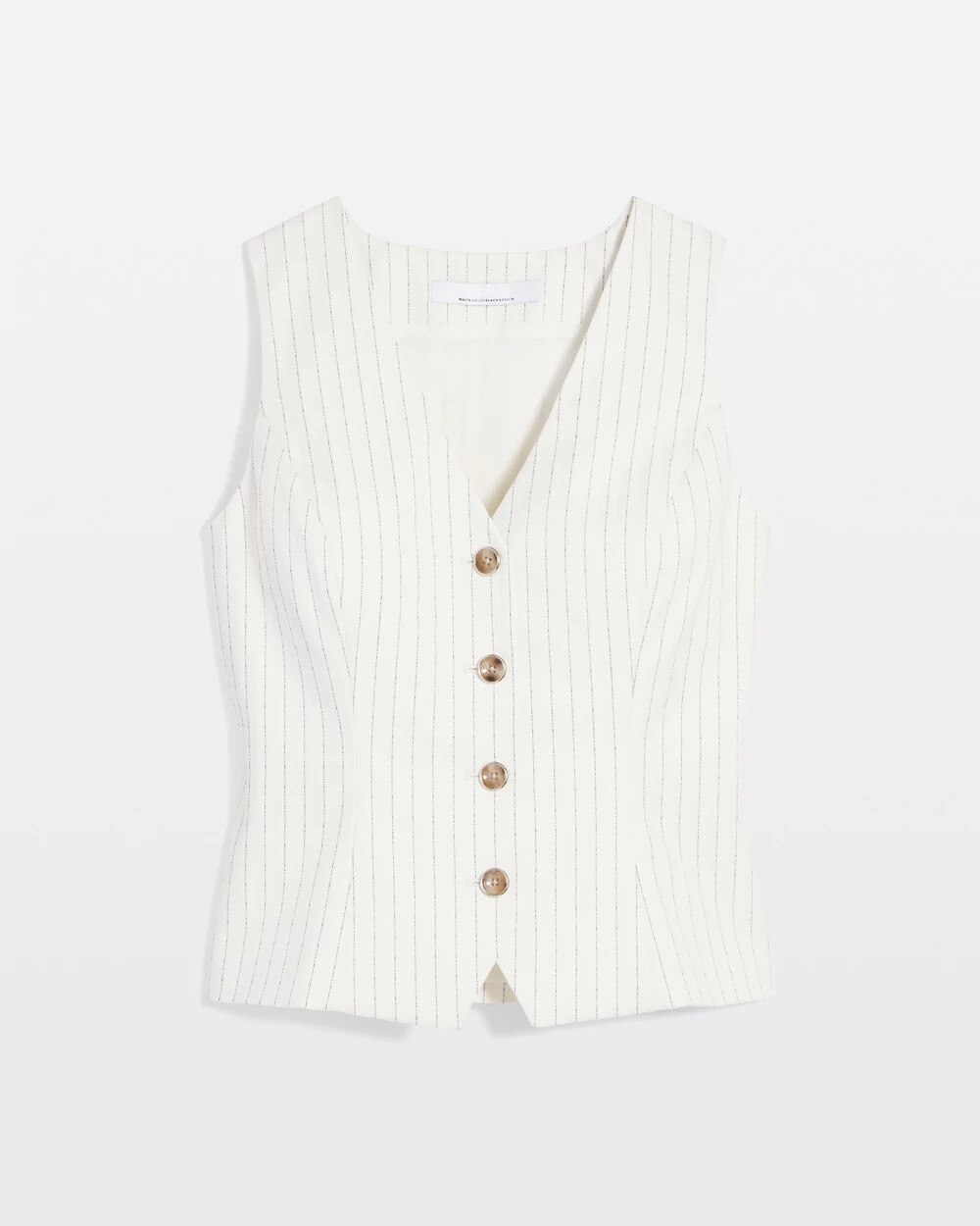 This pinstripe vest is a feminine twist on a menswear staple. The faux tortoise buttons are functional, and the vest is lined. Mix and match with coordinating jacket, pants and shorts.