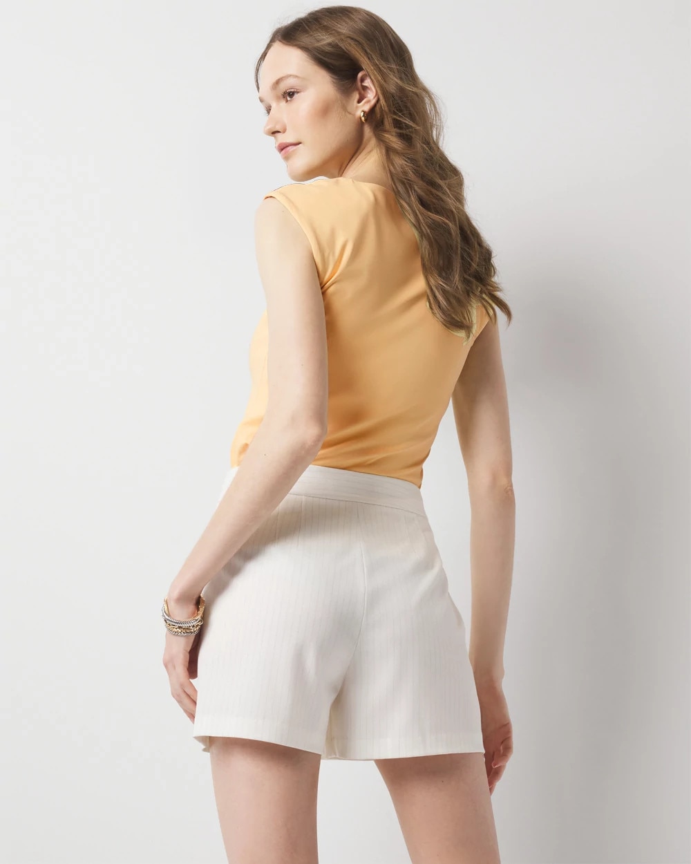 Skorts serve up best of both worlds’ versatility with the coverage of a short, and the feminine look of a skirt. Ours is cut from a pinstriped fabric with metallic thread in the stripe for subtle shine. Pair with matching jacket and top.