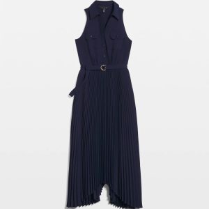 Made from a sateen fabric, this dress plays into the utility trend with cargo pockets and metal ring self-belt. But we’ve added a pleated skirt with shark bite hem to add a feminine element. The buttons are fully functional.