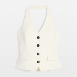 Polished enough for work + glam enough for a night out, this vest is crafted from the double weave fabric you love and designed in a classic halter top silhouette. Four contrasting crest buttons add the finishing touch. Pair with our matching Asymmetric Button Front Pencil Skirt or wear it with denim.