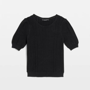 An elbow sleeve sweater with feminine puff sleeve details and a pointelle stitch pattern. Ribbed cuffs and hem finish the look. A perfect transitional piece to pair with your favorite jeans.
