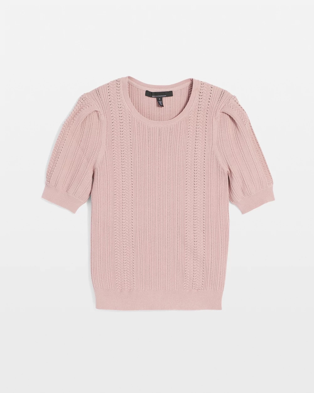 An elbow sleeve sweater with feminine puff sleeve details and a pointelle stitch pattern. Ribbed cuffs and hem finish the look. A perfect transitional piece to pair with your favorite jeans.