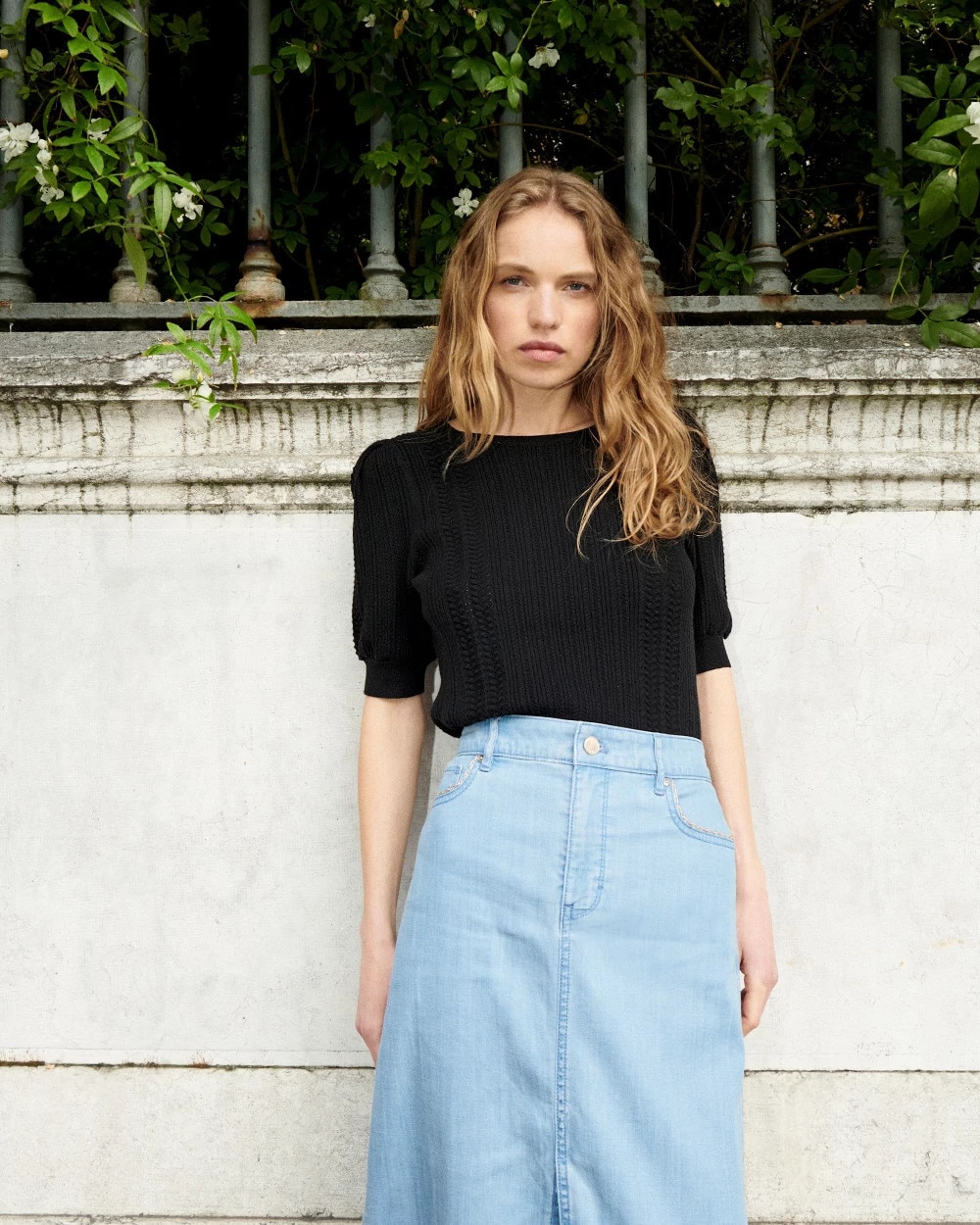 An elbow sleeve sweater with feminine puff sleeve details and a pointelle stitch pattern. Ribbed cuffs and hem finish the look. A perfect transitional piece to pair with your favorite jeans.