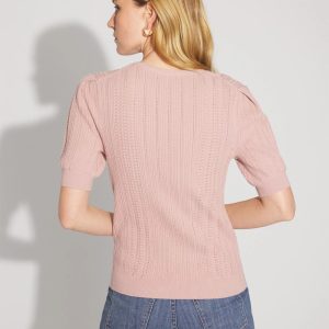 An elbow sleeve sweater with feminine puff sleeve details and a pointelle stitch pattern. Ribbed cuffs and hem finish the look. A perfect transitional piece to pair with your favorite jeans.