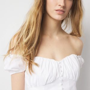 This white cotton-blend poplin top is reminiscent of the best in ‘50s fashion. Designed with soft shirring across the bust and on the puff sleeves, this bustier has a pleated peplum hem and faux front buttons. A feminine + flirty summer top that is perfect for jeans or shorts.