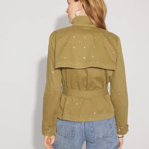 Allover silver studs embellish this casual jacket that gets inspo from the timeless trench coat. Designed with a funnel neck, chest pockets, rain flap, snap closures at the cuffs and a zipper + snap closure, it’s a fun piece to add to your outfits. Pair it with our Pret Studded Ankle Pant for a complete look.