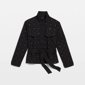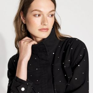 Allover silver studs embellish this casual jacket that gets inspo from the timeless trench coat. Designed with a funnel neck, chest pockets, rain flap, snap closures at the cuffs and a zipper + snap closure, it’s a fun piece to add to your outfits. Pair it with our Pret Studded Ankle Pant for a complete look.