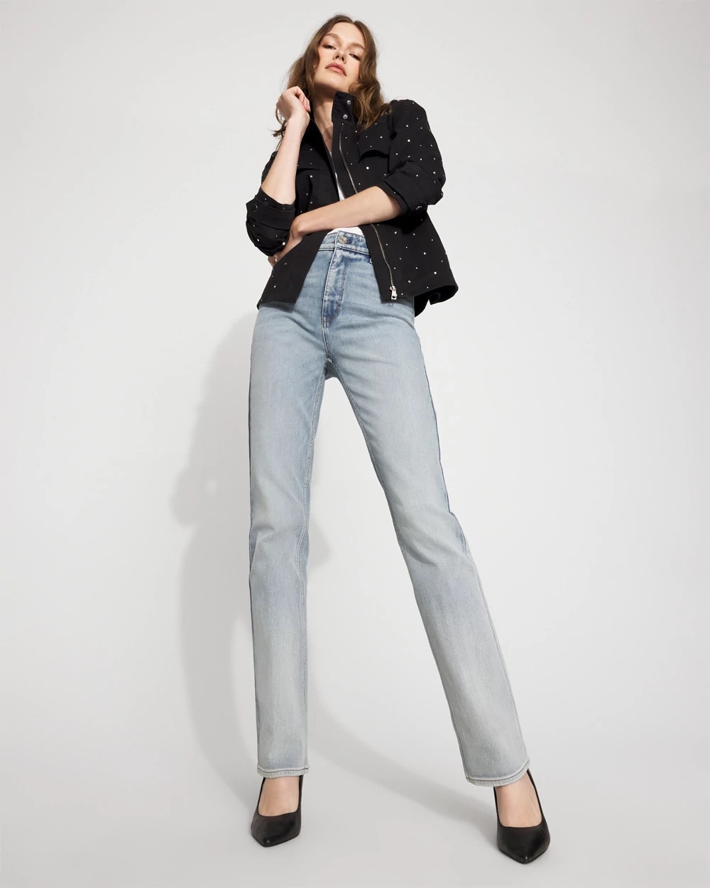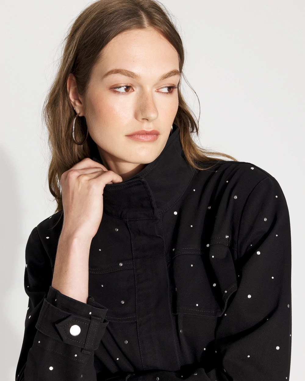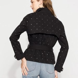 Allover silver studs embellish this casual jacket that gets inspo from the timeless trench coat. Designed with a funnel neck, chest pockets, rain flap, snap closures at the cuffs and a zipper + snap closure, it’s a fun piece to add to your outfits. Pair it with our Pret Studded Ankle Pant for a complete look.