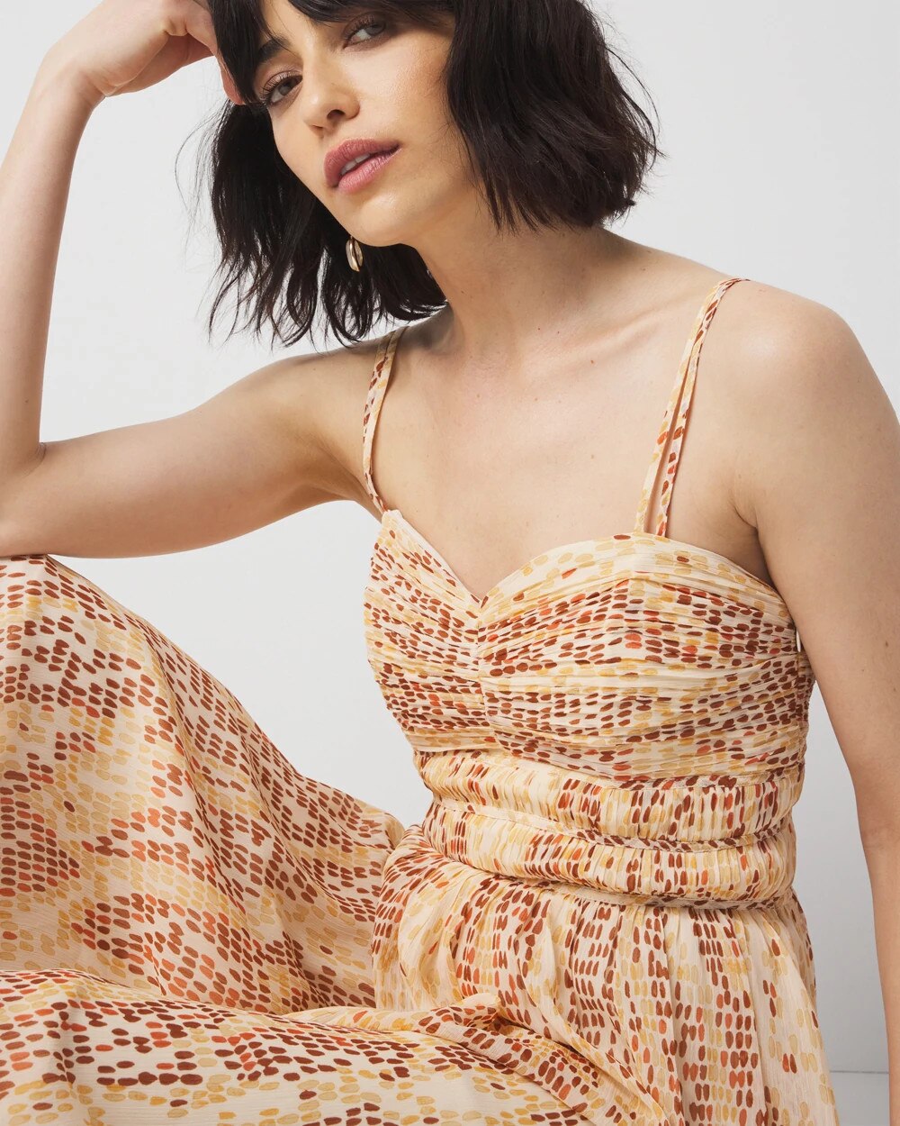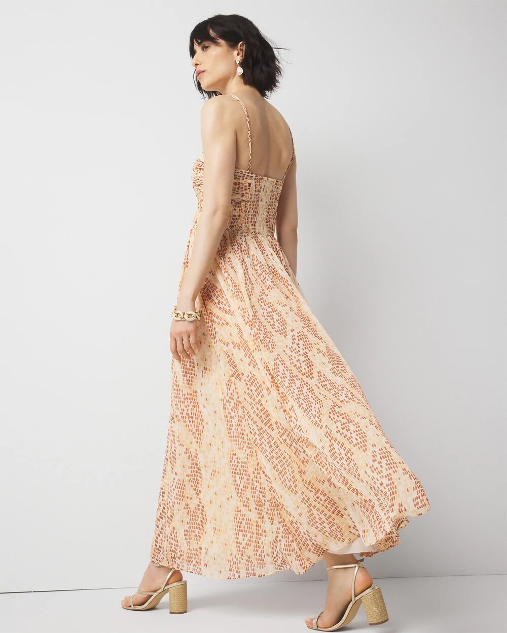 We’re wild about the snake print on this flowy maxi dress with feminine shirring at the bust and waist. A summer classic that can easily be dressed up for a night out or dressed down for a day sightseeing or shopping.