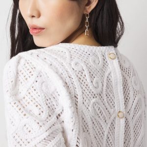 We love the delicate crochet pattern on this 100% cotton short-sleeve pullover. The puff sleeves have elastic cuffs so you can “zhuzh” them as you see fit. Four faux pearl buttons do up in the back.