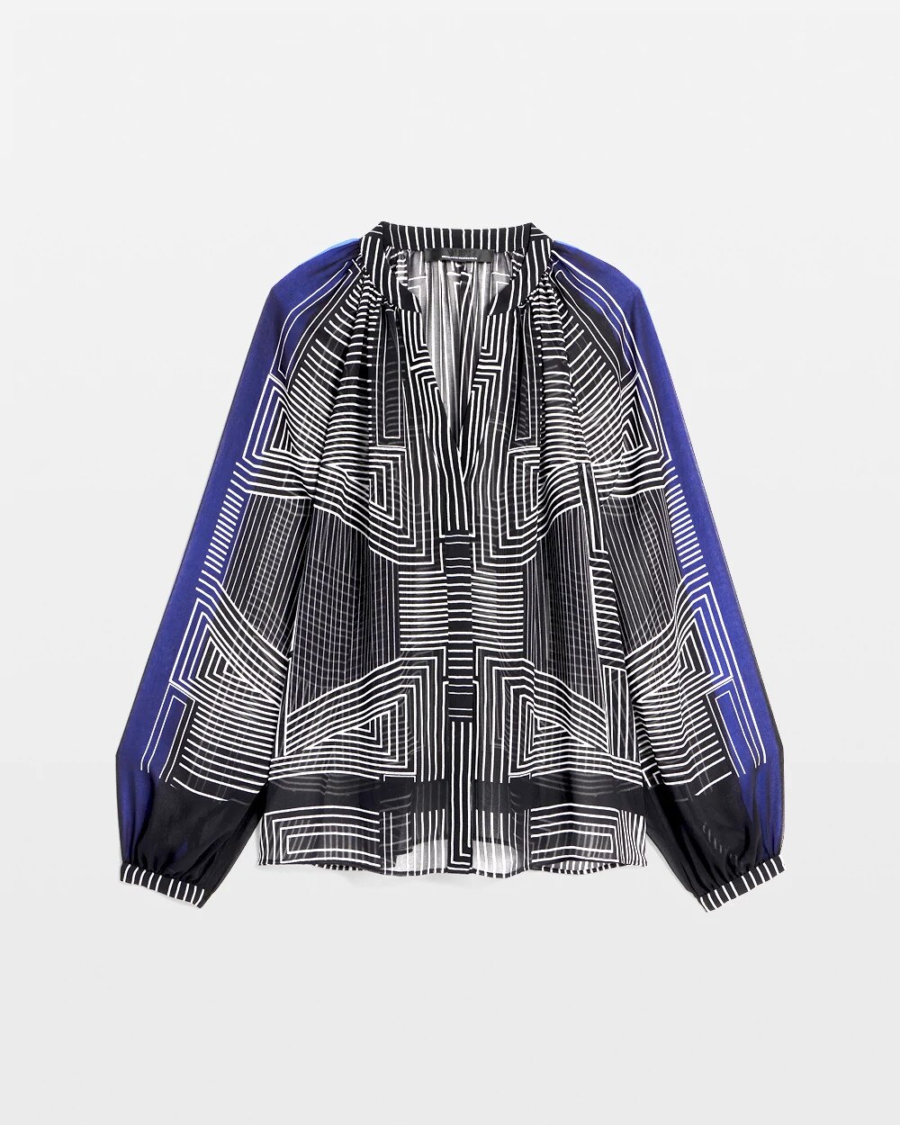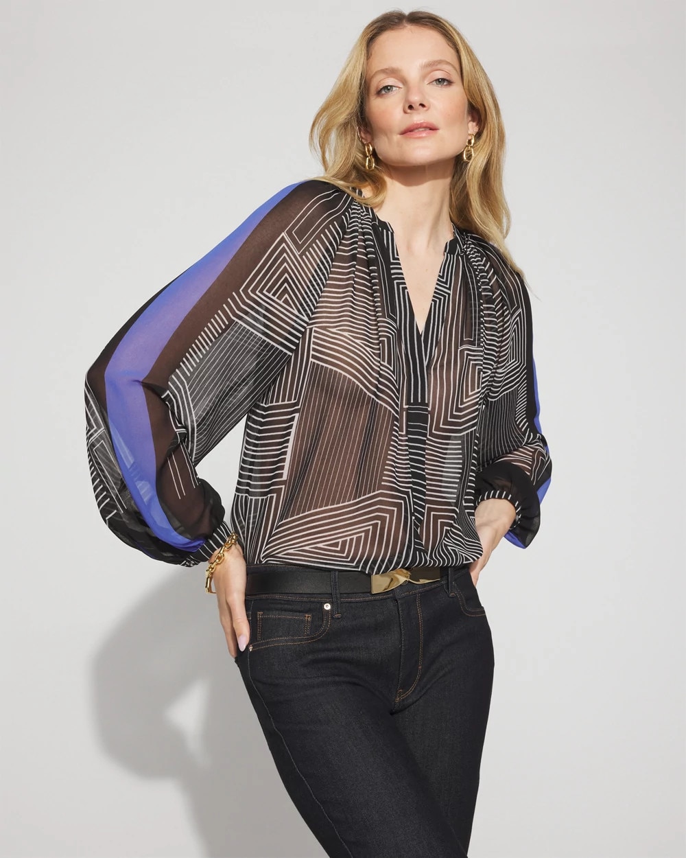A streak of blue adds a bold touch to the geometric print of this timeless blouse. Designed with a raglan blouson sleeve with button cuffs and hidden button placket, this georgette blouse is sheer, so we suggest wearing it with your favorite WHBM FORME™ top.