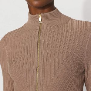 Elevate your casual outfits with this chic, fitted ribbed knit mock neck sweater. The soft gold half-zipper adds a touch of shine.