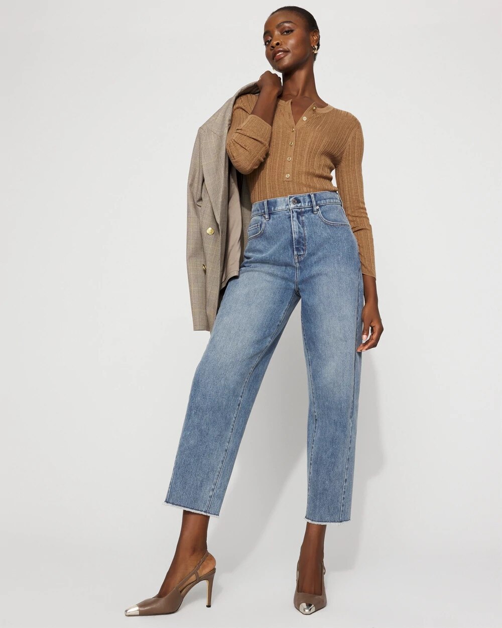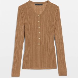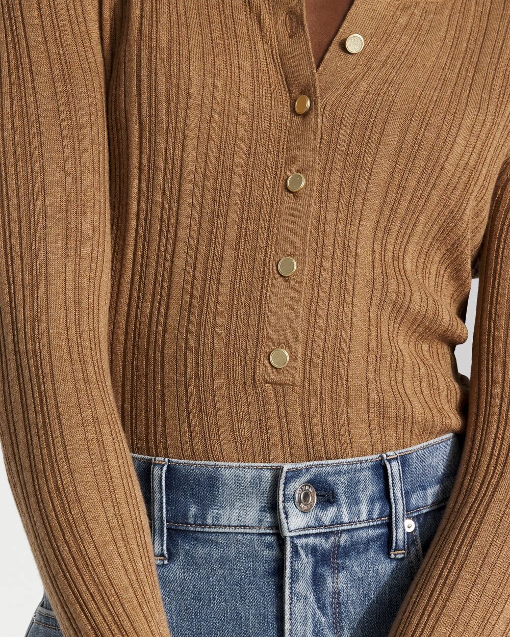 A variegated rib pattern, knit from a Tencel, wool, and silk yarn, elevates this timeless Henley. Wear it with your favorite jeans.