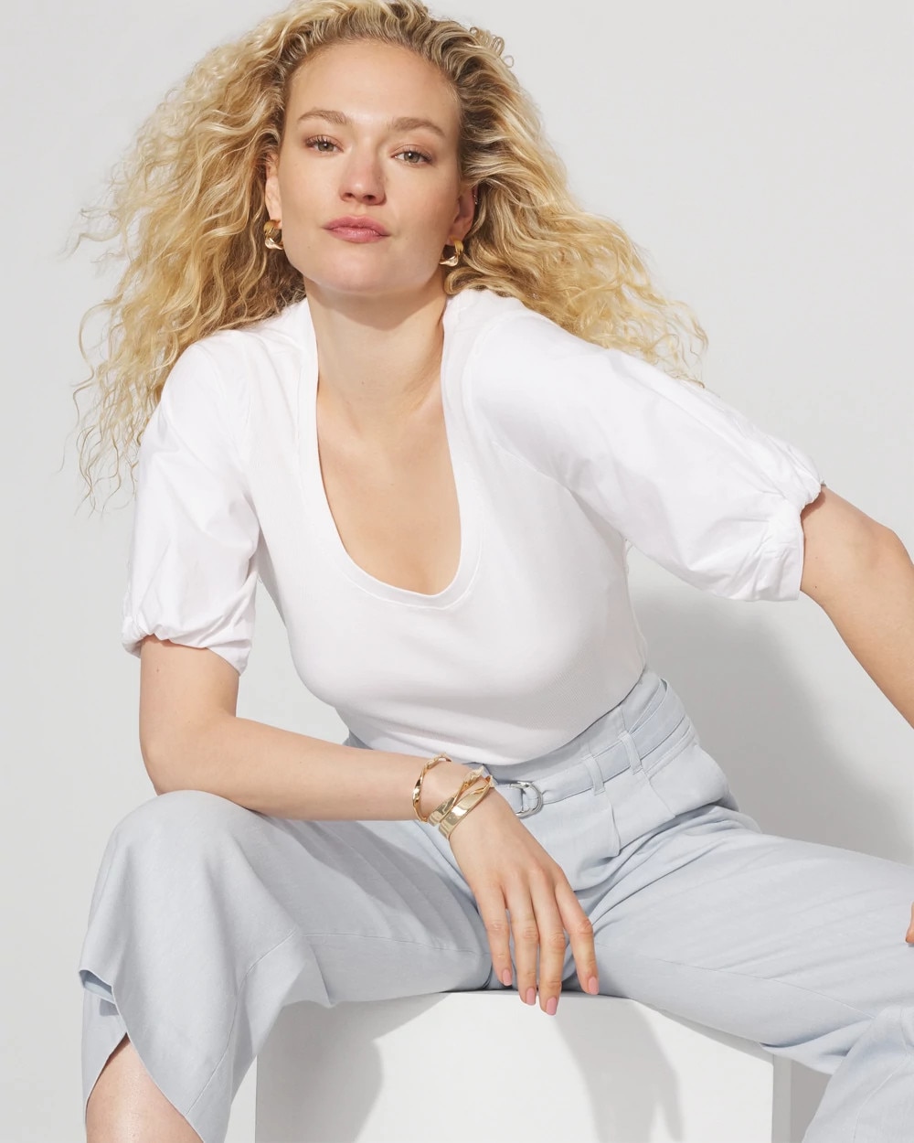 This fitted tee has a soft Pima cotton ribbed body with stretch. The poplin puff sleeve provides contrast and has a twist detail. A dressy t-shirt that will elevate your jeans and shorts.