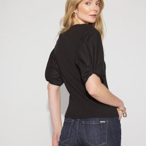 This fitted tee has a soft Pima cotton ribbed body with stretch. The poplin puff sleeve provides contrast and has a twist detail. A dressy t-shirt that will elevate your jeans and shorts.