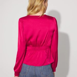 This satin blouse has front ruching and a smocked panel in back to give you a flattering, feminine silhouette and an easy fit. Shirring at the shoulder and cuffs gives this blouse a soft puff sleeve. A romantic and polished look for work or a night out.